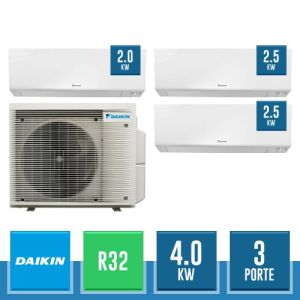 Set dual Daikin MXM Bluevolution Multi, in classe A+++ e gas R32, composto dall'unità esterna 2MXM50A9 da 5.0 kW e dalle unità interne a parete Emura (dotate di Wi-Fi) FTXJ25AW9 da 2.5 kW e FTXJ35AW9 da 3.5 kW.