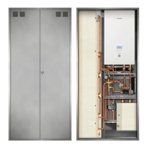 Solution d'encastrement Panasonic Aquarea "1 Zone" composée de: armoire conteneur PAW-A2W-IWFRAME, chaudière 160 litres PAW-A2W-IW160-1, unité de chargement PAW-A2W-IWCRG, kit optionnel 1 zone PAW-A2W-IW1Z (réservoir tampon 30L + 1 circulateur de zone directe) et sonde ballon PAW-TS4.