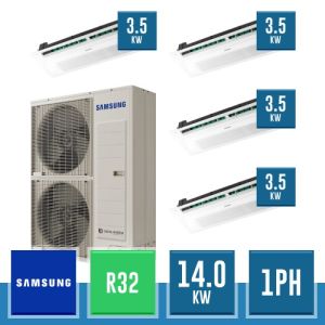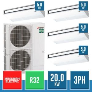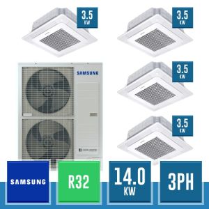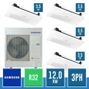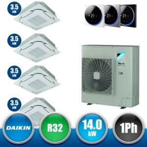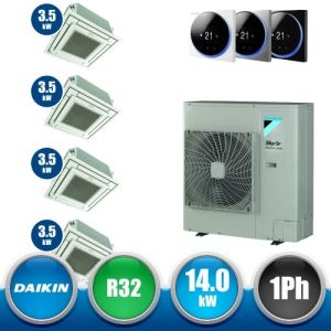 Combinaison Daikin Sky Air Double Twin ADVANCE composée par nr.1 moteur externe triphasé RZASG140MY1 de 48000 BTU, de nr.4 unites internes à cassette Fully Flat à 4 roues avec grille blanche FFA35A de 12000 BTU et par nr.1 joint KHRQ58T. Ce kit &ègrave; alimenté par gaz réfrigérant R32 et appartient à la classe énergétique A.