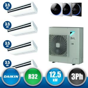 Combinaison Daikin Sky Air Double Twin ADVANCE composée par nr.1 moteur externe triphasé RZASG125MY1 de 42000 BTU, de nr.4 unites internes suspendues au plafond DC Inverseur FHA35A de 12000 BTU et par nr.1 joint KHRQ58T. Ce kit &ègrave; alimenté par gaz réfrigérant R32 et appartient à la classe énergétique A+.