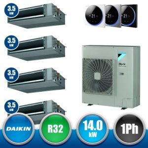 Combinaison Daikin Sky Air Double Twin ADVANCE composée par nr.1 moteur externe monophasé RZASG140MV1 de 48000 BTU, de nr.4 unites internes canalisables à moyenne prévalence DC Inverseur FBA35A9 de 12000 BTU et par nr.1 joint KHRQ58T. Ce kit est alimenté par gaz réfrigérant R32 et appartient à la classe énergétique A.