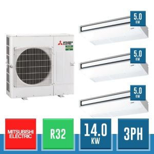 Combinaison Daikin Sky Air Triple ADVANCE composée par nr.1 moteur externe triphasé RZASG140MY1 de 48000 BTU, de nr.3 unites internes à cassette Fully Flat à 4 roues avec grille argent FFA50A de 18000 BTU et par nr.1 collecteur KHRQ58H. Ce kit est alimenté par gaz réfrigérant R32 et appartient à la classe énergétique A.
