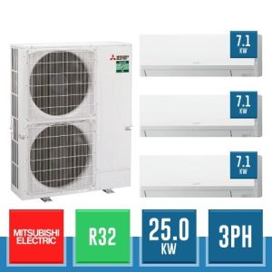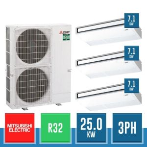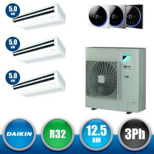 Combinaison Daikin Sky Air Triple ADVANCE composée par nr.1 moteur externe triphasé RZASG125MY1 de 42000 BTU, de nr.3 unites internes suspendues au plafond DC Inverseur FHA50A de 18000 BTU, de nr.1 commande à fil BRC1E53A et par nr.1 collecteur KHRQ58H. Ce kit est alimenté par gaz réfrigérant R32 et appartient à la classe énergétique A+.