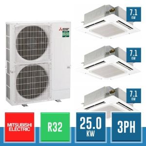 Combinaison Daikin Sky Air Triple ADVANCE composée par nr.1 moteur externe monophasé RZASG140MV1 de 48000 BTU, de nr.3 unites internes à cassette Fully Flat à 4 roues avec grille argent FFA50A de 18000 BTU et par nr.1 collecteur KHRQ58H. Ce kit est alimenté par gaz réfrigérant R32 et appartient à la classe énergétique A.