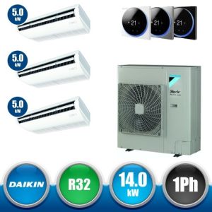 Combinaison Daikin Sky Air Triple ADVANCE composée par nr.1 moteur externe monophasé RZASG140MV1 de 48000 BTU, de nr.3 unites internes suspendues au plafond DC Inverseur FHA50A de 18000 BTU et par nr.1 collecteur KHRQ58H. Ce kit est alimenté par gaz réfrigérant R32 et appartient à la classe énergétique A.