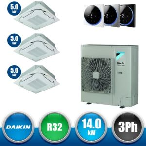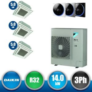 Combinaison Daikin Sky Air Triple ADVANCE composée par nr.1 moteur externe triphasé RZASG140MY1 de 48000 BTU, de nr.3 unites internese à cassette Fully Flat à 4 roues avec grille blanche FFA50A de 18000 BTU et par nr.1 collecteur KHRQ58H. Ce kit est alimenté par gaz réfrigérant R32 et appartient à la classe énergétique A.