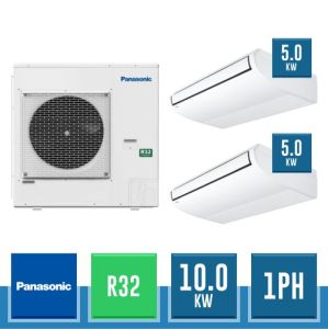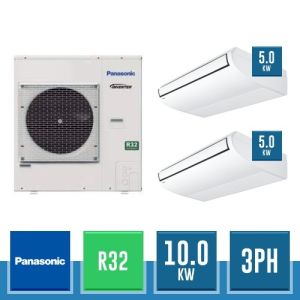 Combinaison Daikin Sky Air Twin ADVANCE composée par nr.1 moteur externe triphasé RZASG100MY1 de 34000 BTU, de nr.2 unites internes suspendues au plafond DC Inverseur FHA50A de 18000 BTU et par nr.1 joint KHRQ58T. Ce kit est alimenté par gaz réfrigérant R32 et appartient à la classe énergétique A++.