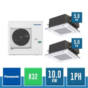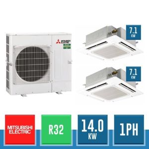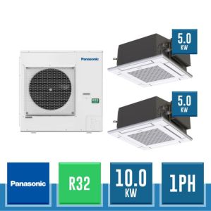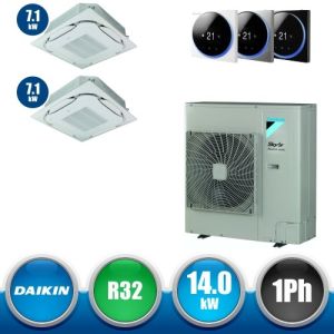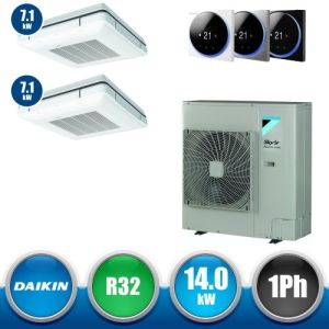 Combinaison Daikin Sky Air Twin ADVANCE composée par nr.1 moteur externe monophasé RZASG140MV1 de 42000 BTU, de nr.2 unites internes à cassette suspendues au plafond FUA71A de 24000 BTU et par nr.1 joint KHRQ58T. Ce kit est alimenté par gaz réfrigérant R32 et appartient à la classe énergétique A.