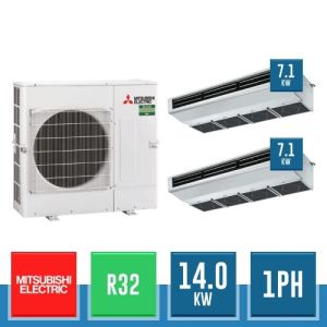 Combinaison Daikin Sky Air Twin ADVANCE composée par nr.1 moteur externe monophasé RZASG140MV1 de 42000 BTU, de nr.2 unites internes suspendues au plafond DC Inverseur FHA71A de 24000 BTU et par nr.1 joint KHRQ58T. Ce kit est alimenté par gaz réfrigérant R32 et appartient à la classe énergétique A.