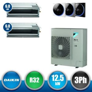 Combinaison Daikin Sky Air Twin ADVANCE composée par nr.1 moteur externe triphasé RZASG125MY1 de 42000 BTU, de nr.2 unites internes canalisables à moyenne prévalence DC Inverseur FBA60A9 de 21000 BTU et par nr.1 joint KHRQ58T. Ce kit est alimenté par gaz réfrigérant R32 et appartient à la classe énergétique A+.