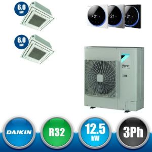 Combinaison Daikin Sky Air Twin ADVANCE composée par nr.1 moteur externe triphasé RZASG125MY1 de 42000 BTU, de nr.2 unites internes à cassette Fully Flat à 4 roues avec grille argent FFA60A de 21000 BTU et par nr.1 joint KHRQ58T. Ce kit est alimenté par gaz réfrigérant R32 et appartient à la classe énergétique A+.