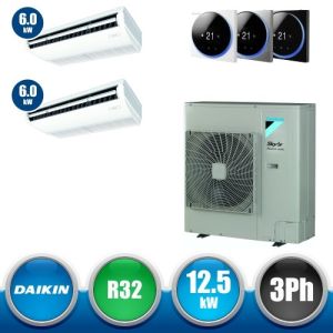 Combinaison Daikin Sky Air Twin ADVANCE composée par nr.1 moteur externe triphasé RZASG125MY1 de 42000 BTU, de nr.2 unites internes suspendues au plafond DC Inverseur FHA60A de 21000 BTU et par nr.1 joint KHRQ58T. Ce kit est alimenté par gaz réfrigérant R32 et appartient à la classe énergétique A+.