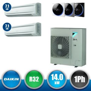 Combinaison Daikin Sky Air Twin ADVANCE composée par nr.1 moteur externe monophasé RZASG140MV1 de 42000 BTU, de nr.2 unites internes murales FAA71B de 24000 BTU et par nr.1 joint KHRQ58T. Ce kit est alimenté par gaz réfrigérant R32 et appartient à la classe énergétique A.
