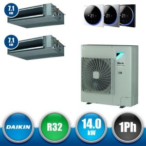 Combinaison Daikin Sky Air Twin ADVANCE composée par nr.1 moteur externe monophasé RZASG140MV1 de 48000 BTU, de nr.2 unites internes canalisables à moyenne prévalence DC Inverseur FBA71A9 de 24000 BTU, de nr.1 commande à fil BRC1E53A et par nr.1 joint KHRQ58T. Ce kit est alimenté par gaz réfrigérant R32 et appartient à la classe énergétique A.