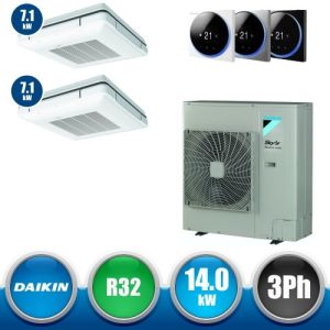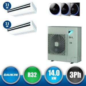 Combinaison Daikin Sky Air Twin ADVANCE composée par nr.1 moteur externe triphasé RZASG140MY1 de 42000 BTU, de nr.2 unites internes suspendues au plafond DC Inverseur FHA71A de 24000 BTU et par nr.1 joint KHRQ58T. Ce kit est alimenté par gaz réfrigérant R32 et appartient à la classe énergétique A.