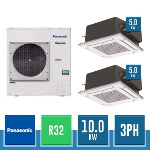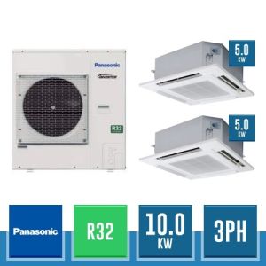 Combinaison Daikin Sky Air Twin ADVANCE composée par nr.1 moteur externe triphasé RZASG100MY1 de 34000 BTU, de nr.2 unites internes à cassette Fully Flat à 4 roues avec grille blanche FFA50A de 18000 BTU et par nr.1 joint KHRQ58T. Ce kit est alimenté par gaz réfrigérant R32 et appartient à la classe énergétique A++.
