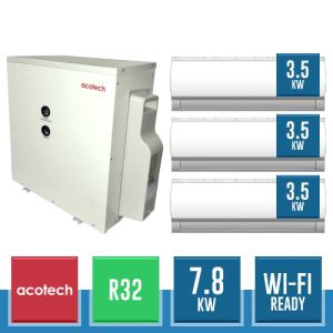 Kit trialsplit ad espansione diretta acqua/aria con resa nominale di 7.8 kW, in classe A++ e gas R32, composto dalla pompa di calore multisplit HM3PCIN0830.78 con dispositivo risparmio acqua e da 3 unità a parete ISZZ-35UI-R32 da 3.5 kW con predisposizione Wi-Fi.