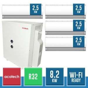 Kit quadrisplit ad espansione diretta acqua/aria con resa nominale di 8.2 kW, in classe A++ e gas R32, composto dalla pompa di calore multisplit HM4PCIN1516.82 con dispositivo risparmio acqua e da 4 unità a parete ISZZ-25UI-R32 da 2.5 kW con predisposizione Wi-Fi.