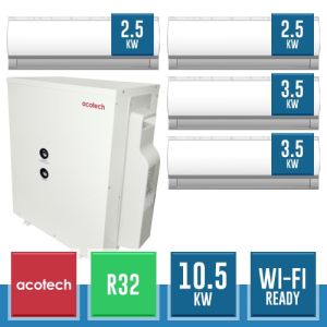 Kit quadrisplit ad espansione diretta acqua/aria con resa nominale di 10.5 kW, in classe A++ e gas R32, composto dalla pompa di calore multisplit HM4PCIN1526.105 con dispositivo risparmio acqua e dalle unità a parete ISZZ-25UI-R32 (x3) e ISZZ-35UI-R32 da 2.5 e 3.5 kW con predisposizione Wi-Fi.