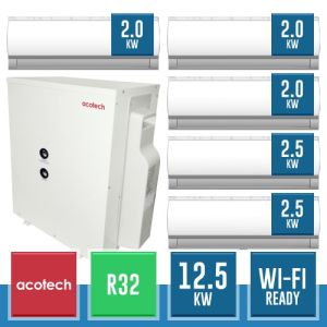 Kit pentasplit ad espansione diretta acqua/aria con resa nominale di 12.5 kW, in classe A++ e gas R32, composto dalla pompa di calore multisplit HM5PCIN1534.125 con dispositivo risparmio acqua e dalle unità a parete ISZZ-20UI-R32 (x3) e ISZZ-25UI-R32 (x2) da 2.0 e 2.5 kW con predisposizione Wi-Fi.