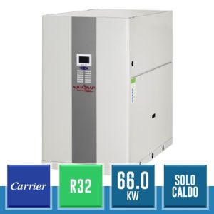 Pompa di calore acqua/acqua Carrier 61WG-060A, con compressore scroll a velocità fissa ed alimentazione trifase, con una resa in caldo di 76 kW. Questa unità è certificata Eurovent e il primo avviamento è incluso nel prezzo.