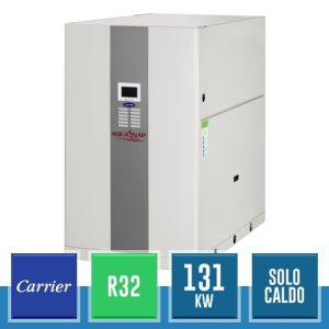 Pompa di calore acqua/acqua Carrier 61WG-110A, con compressore scroll a velocità fissa ed alimentazione trifase, con una resa in caldo di 131 kW. Questa unità è certificata Eurovent e il primo avviamento è incluso nel prezzo.