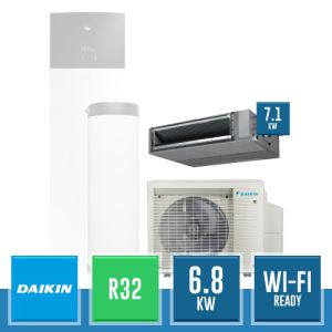 Kit Daikin Multi+, dotato di tecnologia Inverter e gas refrigerante R32, composto dal motore 5MWXM68A9 da 6.8 kW, dalla canalizzabile a media prevalenza FBA71A9 da 7.1 kW e da un serbatoio ACS a scelta (90, 120, 180 o 230 litri).