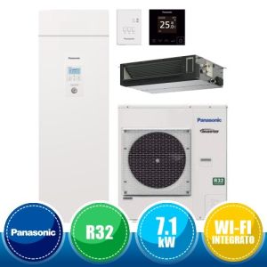 Panasonic Aquarea EcoFleX con alimentazione monofase da 8.0 kW, in classe A++ e gas R32, composto dall'unità interna WH-ADF0309J3E5CM con serbatoio da 185 litri, dall'unità interna canalizzata S-71WF3E  e dall'unità esterna a recupero di calore CU-2WZ71YBE5. Completano il kit l'interfaccia Wi-Fi CZ-TAW1 ed il comando a filo CZ-RTC6BLW.