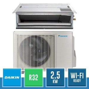 Kit monosplit canalizzabile Daikin da 2.5 kW, in gas R32, composto dall'unità esterna RXM25A8 Bluevolution e dall'unità interna canalizzabile ultrapiatta FDXM25F9 Mini Sky a media prevalenza con predisposizione Wi-Fi.