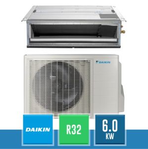 Kit monosplit canalizzabile Daikin da 6.0 kW, in gas R32, composto dall'unità esterna RXM60A Bluevolution e dall'unità interna canalizzabile ultrapiatta FDXM60F9 Mini Sky a media prevalenza con predisposizione Wi-Fi.