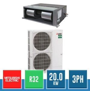 Kit monosplit Mitusbishi Electric in gas R32, con resa da 20.0 kW e alimentazione trifase, composto dall'unità esterna Standard Inverter PUZ-M200YKA2 e dall'unità interna canalizzata ad alta prevalenza PEA-M200LA2 con predisposizione Wi-Fi.