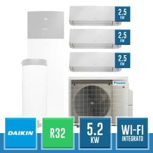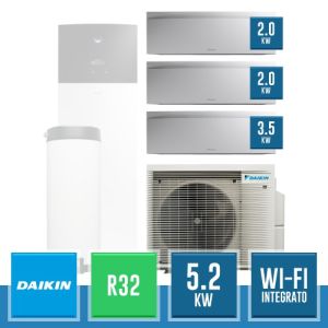 Kit trialsplit Daikin Multi+, dotato di tecnologia Inverter e gas refrigerante R32, composto dal motore 4MWXM52A da 5.2 kW, dagli split Emura FTXJ25AW9 (x2) e FTXJ35AW9 da 2.5 e 3.5 kW con Wi-Fi integrato e da un serbatoio ACS a scelta (90, 120, 180 o 230 litri).