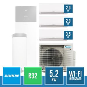 Kit trialsplit Daikin Multi+, dotato di tecnologia Inverter e gas refrigerante R32, composto dal motore 4MWXM52A da 5.2 kW, dagli split Stylish FTXA20CW (x2) e FTXA35CW da 2.0 e 3.5 kW con Wi-Fi integrato e da un serbatoio ACS a scelta (90, 120, 180 o 230 litri).