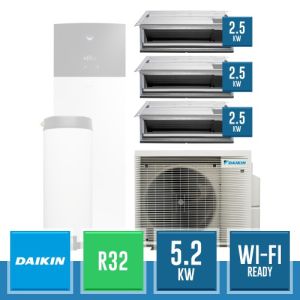 Kit trialsplit Daikin Multi+, dotato di tecnologia Inverter e gas refrigerante R32, composto dal motore 4MWXM52A da 5.2 kW, da 3 canalizzabili a bassa prevalenza FDXM25F9 da 2.5 kW e da un serbatoio ACS a scelta (90, 120, 180 o 230 litri).
