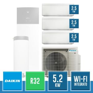 Kit trialsplit Daikin Multi+, dotato di tecnologia Inverter e gas refrigerante R32, composto dal motore 4MWXM52A da 5.2 kW, da 3 split Emura FTXJ25AW9 da 2.5 kW con Wi-Fi integrato e da un serbatoio ACS a scelta (90, 120, 180 o 230 litri).