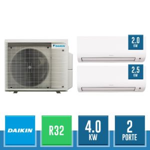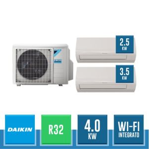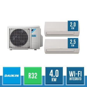 Kit dualsplit Daikin Bluevolution, in classe A+++ e gas R32, composto dall'unità esterna con pompa di calore Inverter 2MXM40A9 da 4.0 kW e da 2 unità interne a parete Comfora FTXP25N9 da 2.5 kW con Wi-Fi integrato.