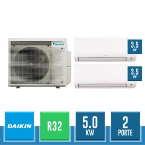 Kit dualsplit Daikin Bluevolution, in classe A+++ e gas R32, composto dall'unità esterna con pompa di calore Inverter 2MXM50A9 da 5.0 kW e da 2 unità interne a parete Comfora FTXP35N9 da 3.5 kW con Wi-Fi integrato.