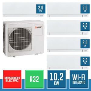 Set pentasplit Mitsubishi Electric in classe A++, dotato di DC Inverter e pompa di calore in R32, composto dall'unità esterna multisplit MXZ-5F102VF da 10.2 kW e da 5 unità interne a parete MSZ-AY20VGKP da 2.0 kW con Wi-Fi integrato.