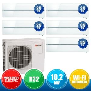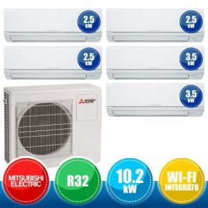 Set pentasplit Mitsubishi Electric in classe A++, dotato di DC Inverter e pompa di calore in R32, composto dall'unità esterna multisplit MXZ-5F102VF da 10.2 kW e dalle unità interne a parete MSZ-AY25VGKP (x3) e MSZ-AY35VGKP (x2) da 2.5 e 3.5 kW con Wi-Fi integrato.