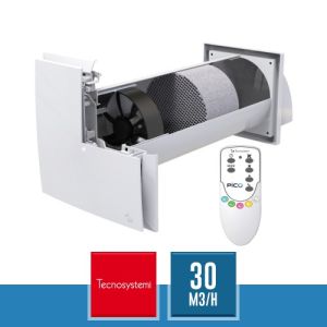 Aspiratore/estrattore statico TecnoSystemi ACD100052 Pico PRO+ 30, con recupero di calore puntuale a parete e telecomando, capace di assicurare una portata d'aria di 30 m³/h. Funzioni Master/Slave (fino a 4 unità), Free Cooling e Free Heating. Ø del tubo: 103 mm.