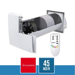 Aspiratore/estrattore statico TecnoSystemi ACD100053 Pico PRO+ 45, con recupero di calore puntuale a parete e telecomando, capace di assicurare una portata d'aria di 45 m³/h. Funzioni Master/Slave (fino a 4 unità), Free Cooling e Free Heating. Ø del tubo: 128 mm.