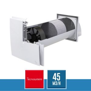 Aspiratore/estrattore statico TecnoSystemi ACD100061 Pico Basic 45, con recupero di calore puntuale a parete, capace di assicurare una portata d'aria di 45 m³/h. Ø del tubo: 128 mm.