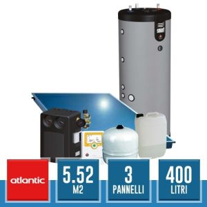 Kit Helio Plan 3x Atlantic ACV con bollitore Smart ME 400, ideale per 4/5 persone, composto da: nr.3 collettori solari Helio Plan 2.0, centralina solare Solar Unit 100, gruppo idraulico Solar Group 100 ERP, vaso di espansione solare da 25 litri e tanica di liquido antigelo (10 lt).