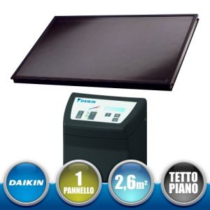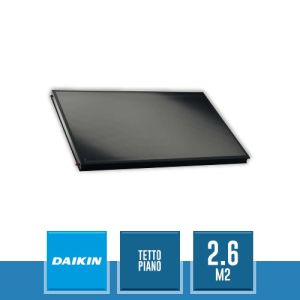 Kit Daikin Solaris in pressione SB.SK1H26PTP, per installazione su tetto piano, composto da 1 collettore H26P (superficie 2.6 mq). Accessori inclusi: stazione solare e centralina di comando, elementi di montaggio e connessione collettori, tubi di collegamento.