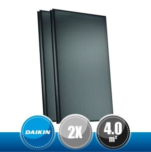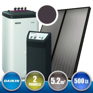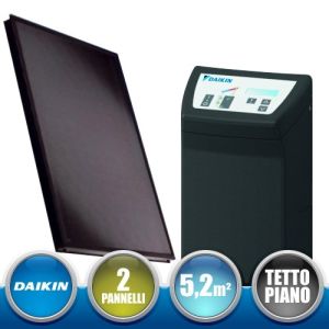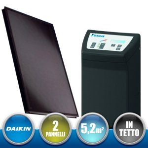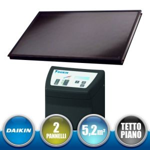Kit Daikin Solaris in pressione SB.SK2H26PTP, per installazione su tetto piano, composto da 2 collettori H26P (superficie 5.2 mq). Accessori inclusi: stazione solare e centralina di comando, elementi di montaggio e connessione collettori, tubi di collegamento.