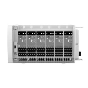 Morsettiera a 6 canali e 9 attuatori Daikin EKRUFHT61V3 con alimentazione 230V, serie Daikin Home Controls per sistema radiante a pavimento multizona in riscaldamento e raffrescamento, per installazione a muro o su barra DIN.