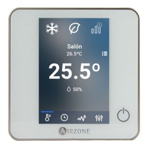 Termostato bianco AirZone Blueface Zero AZCE6BLUEZEROCB,con interfaccia grafica a colori per il controllo di zona in un sistema a zone, che si collega tramite cavo.