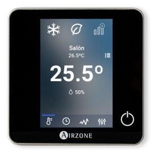 Termostato nero AirZone Blueface Zero AZCE6BLUEZEROCN,con interfaccia grafica a colori per il controllo di zona in un sistema a zone, che si collega tramite cavo.