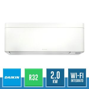Unità a parete Daikin Stylish FTXA20CW da 2.0 kW, serie Bluevolution in classe A+++ con gas R32 e Wi-Fi integrato, in finitura bianco cristallo opaco.