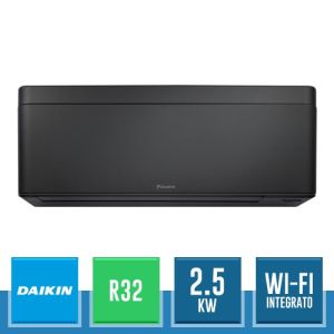 Unità a parete Daikin Stylish FTXA25CB da 2.5 kW, serie Bluevolution in classe A+++ con gas R32 e Wi-Fi integrato, in finitura nero opaco.
